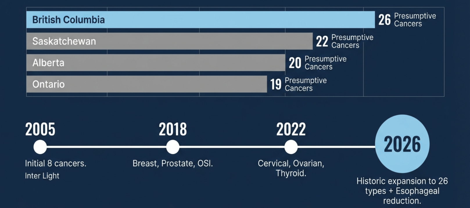 On behalf of the BCPFFA executive board, we are proud to share that as of March 16, 2026, eight additional cancers are officially recognized in British Columbia. This milestone expands our presumptive cancer coverage to 26, the highest in the country. Including Heart Injury and Operational Stress Injury. B.C. fire fighters now lead the nation with 28 total presumptive protections. These additions remove critical barriers for our members, shifting the burden of proof to ensure faster access to care.